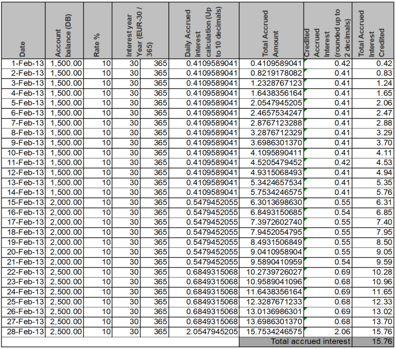 The following table shows the interest accrual for the month of February (28days) if the Interest year is EUR-30 / 365