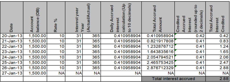 | GL mapped for the Product as ‘Authorised debit interest – Income’ | Transaction code mapped for the product as ‘Interest received - within limit (CR / GL)’ | 15-Jan-13 | 15-Jan-13 | Account currency | Accrued interest of 15-Jan-13 + difference of interest because of catch up = 1.92+0.54 = 2.46 | Credit |