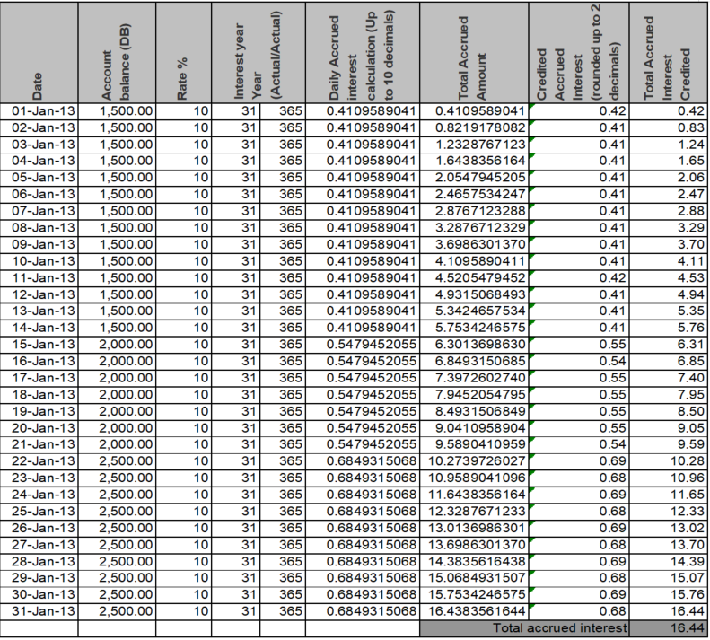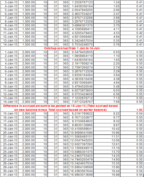 Note: In the above example, on 28-Feb-13, accrual has been posted for the actual accrual of 28-Feb-13 plus 2 additional days, since the interest is to be calculated for 30 days.