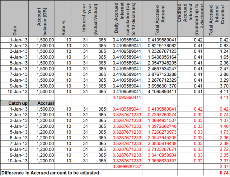The accrual from 2-Jan-2013 until 10-Jan-2013 is checked and system posts adjustment entry. It recalculates the new accrual, highlighted in Red in the below example. The earlier accrual will then be compared with the new accrual when there is a past value dated entry and the difference amount is posted as a correction (positive or negative) as an adjustment entry.