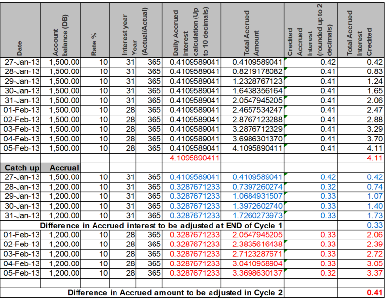 Cycle 1 Start date — 01-Jan-13 Cycle 1 End date — 31-Jan-13 Cycle 2 Start date — 01-Feb-13 Cycle 2 End date — 28-Feb-13.Continuing with the example, if there is a past value-dated reversal recorded for Value-date 28-Jan-13 on Book-date 06-Feb-13 for 300.00; Aura first does the catch-up accrual from 28-Jan-2013 until 31-Jan-2013 and posts an adjustment entry in the end of Cycle 1 (4 days); and will again do a catch-up accrual for Cycle 2 from 01-Feb-2013 until 05-Feb-2013 (5 days).