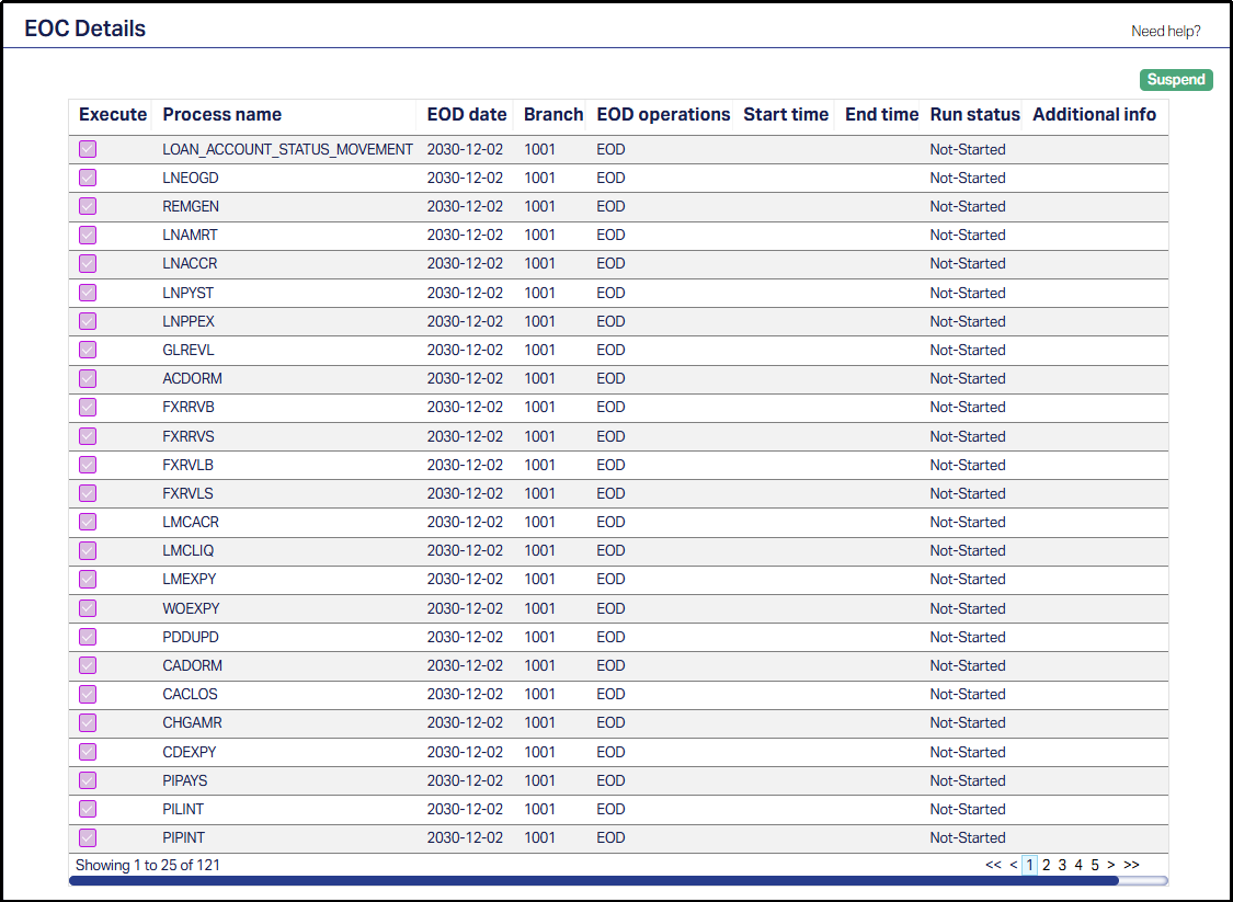 The Execute check-box does not trigger execution. It is simply used to select which processes are selected for suspension.Process name: This displays the system-defined name of the EOC process configured for the branch.