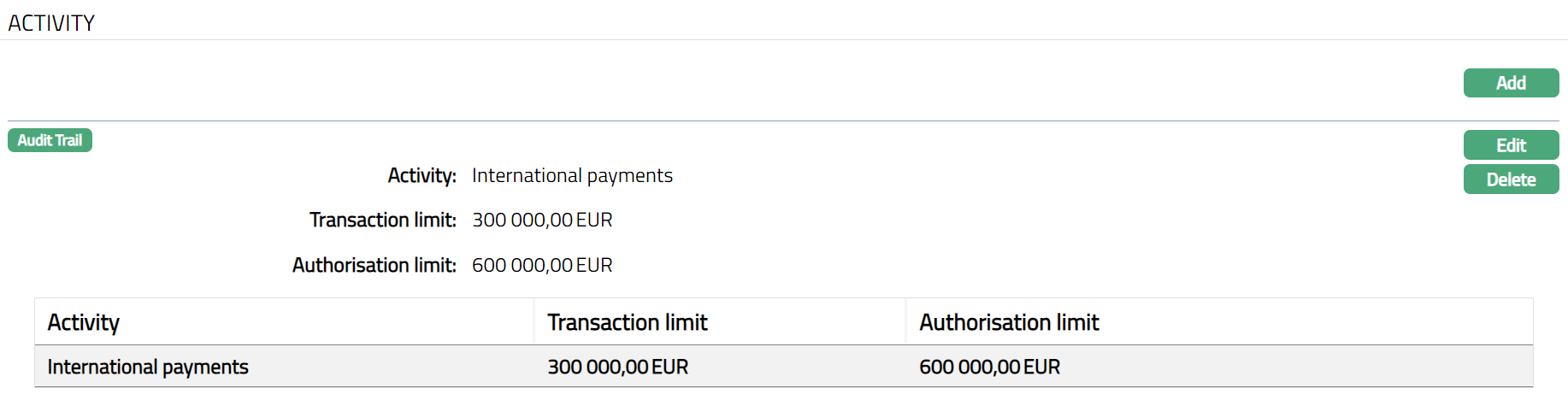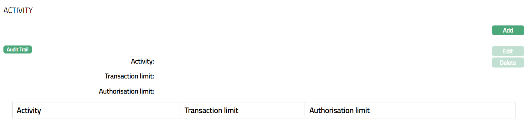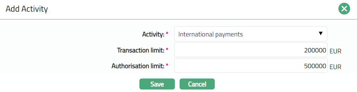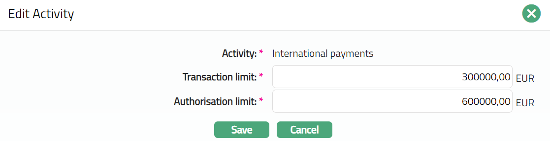 Enter Authorisation Limit for the selected Activity.