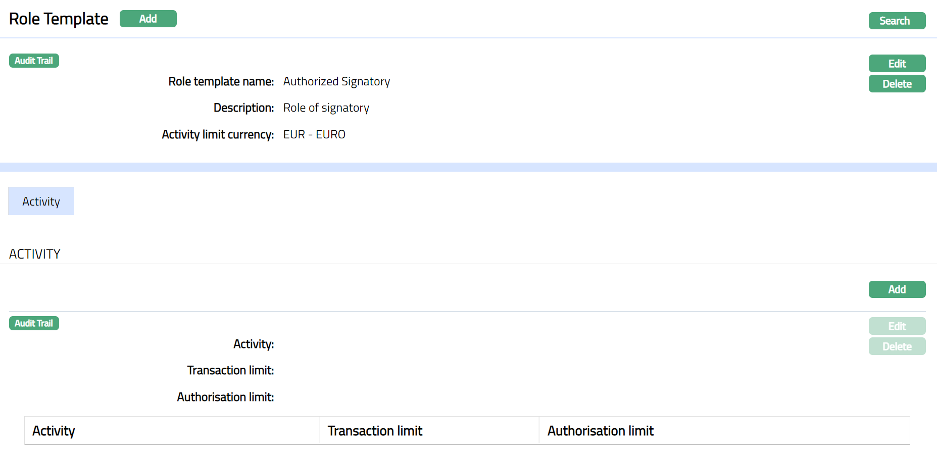 Activity is the default and only tab under role Template. This tab allows you to maintain all the relevant activity for Role Template.