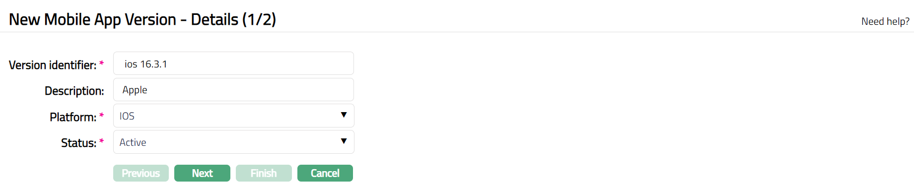 Click Add. New Mobile App Version - Details (1/2) page appears.