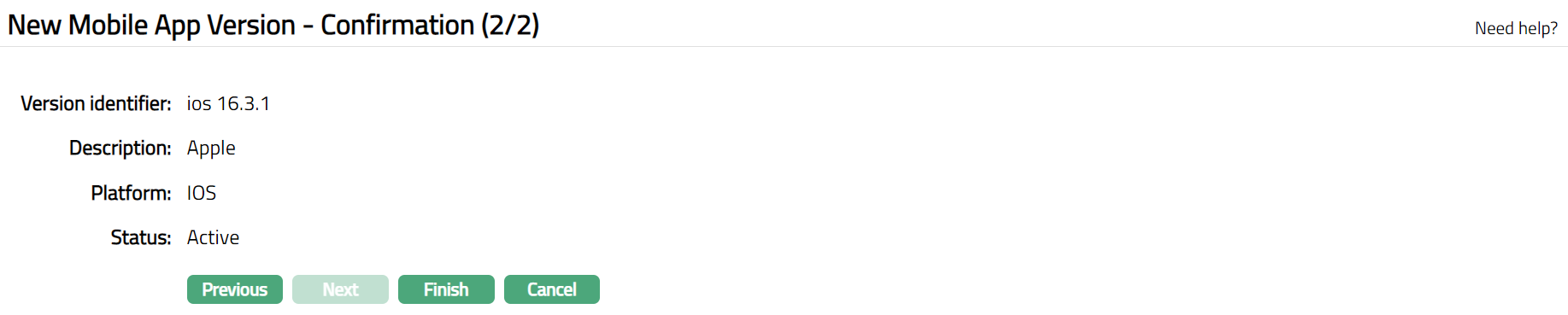Click Next. New Mobile App Version - Confirmation (2/2) page appears.