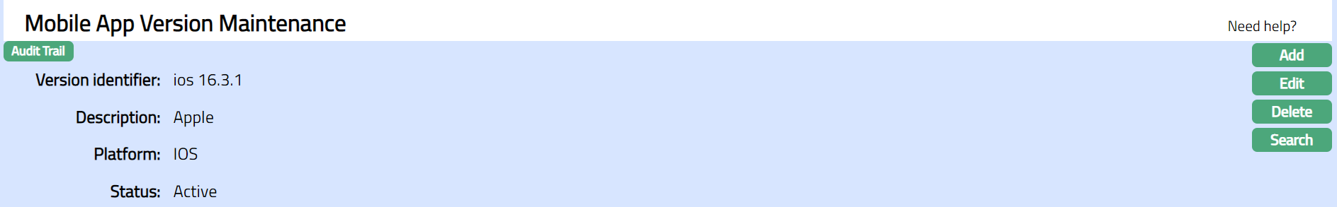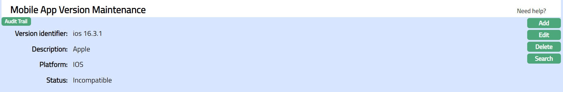 Click Save. Mobile App Version Maintenance page appears with the edited details.