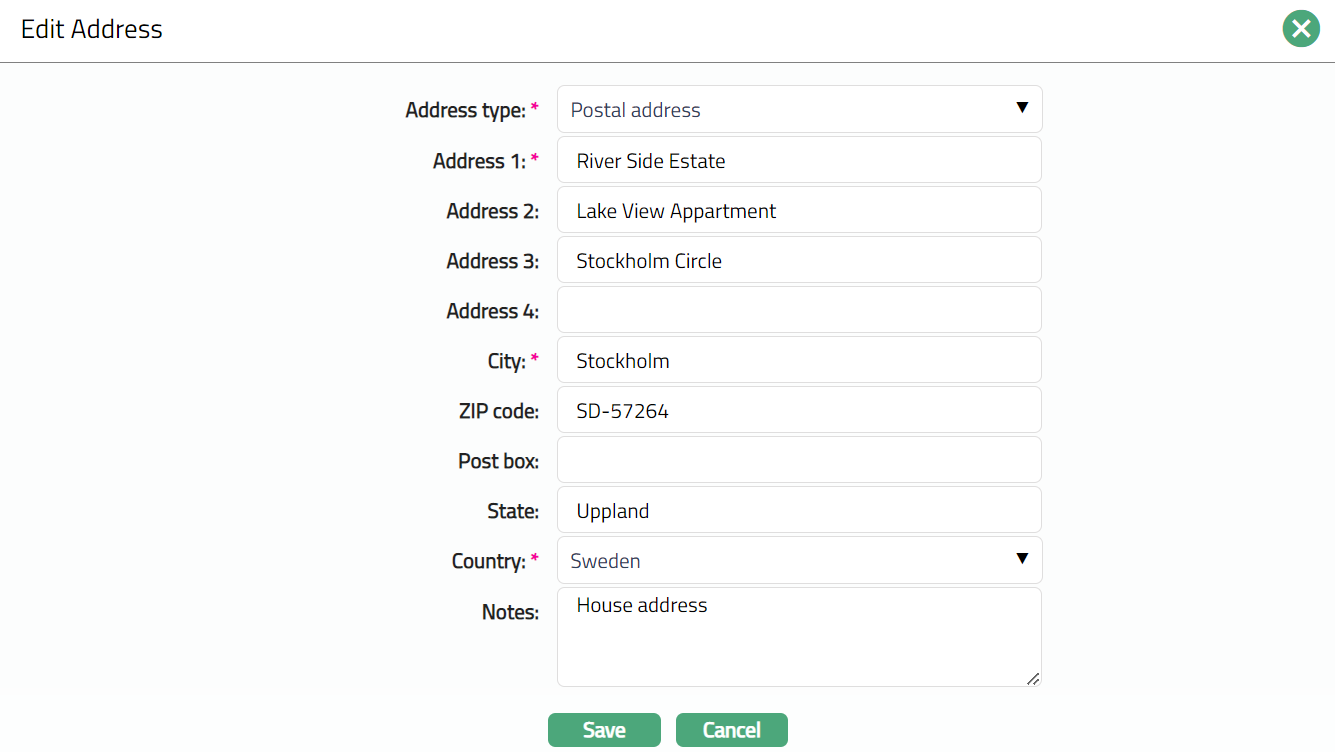 Delete: You can delete an Address detail by clicking on Delete button. Aura will ask for confirmation, on approving which the selected Address details will be deleted.