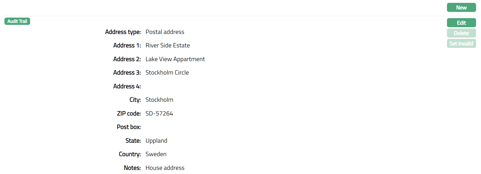 Set Invalid: You can set an Address as invalid by a click on Set Invalid. This means that the particular Address record is no more valid for the financial institution / Intermediary. Aura will ask for confirmation. On confirmation, the Address is made invalid and Set Valid button appear in place of Set Invalid button.