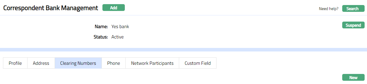 - Access Correspondent Bank Management page and click Clearing Numbers tab.