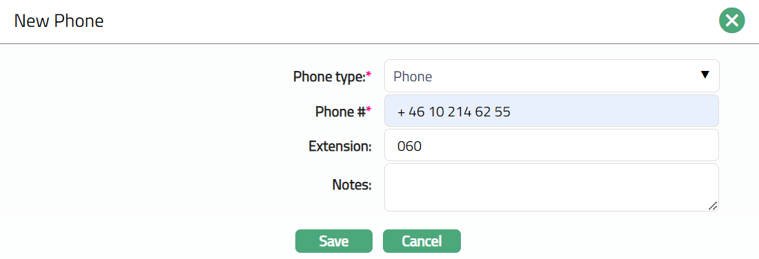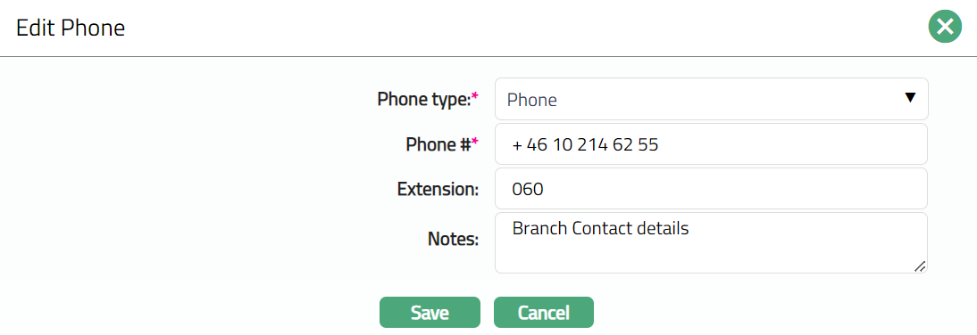 Select Phone type from the drop-down list of options maintained under Admin > System codes > Address details > Phone types.