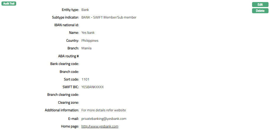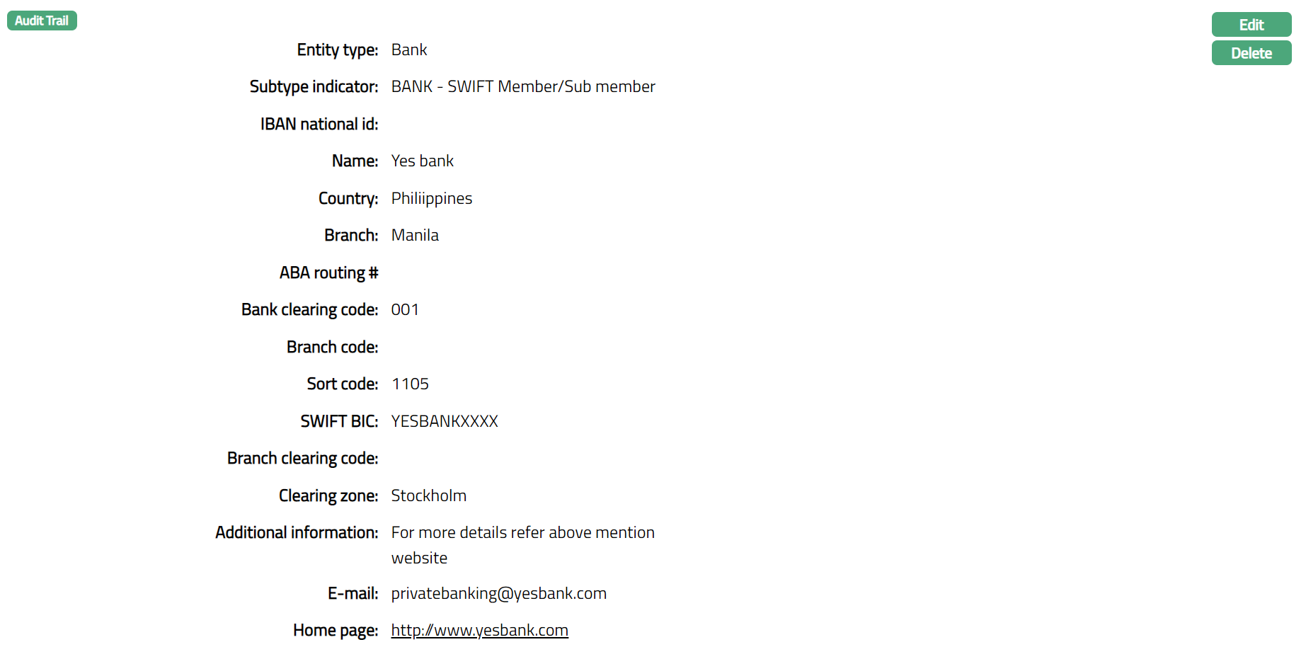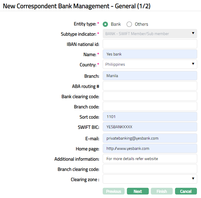 For example, if Entity country = Philippines, then Clearing network will display SWIFT and PCHC.