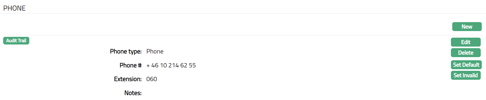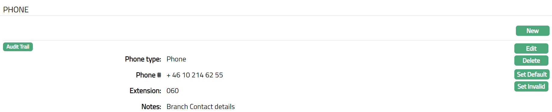 Set Default: When you create multiple phone records, you can set one of them as the default phone record using the Set Default function. When there is only one phone record, the same is taken as the default phone.
