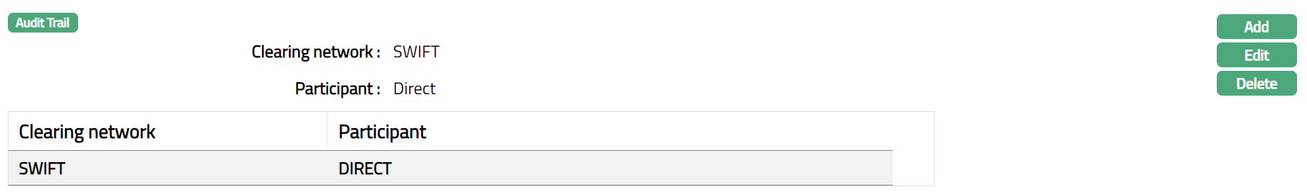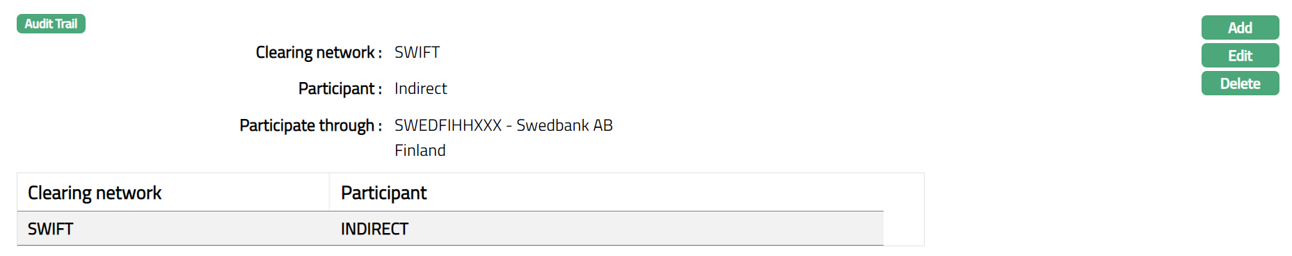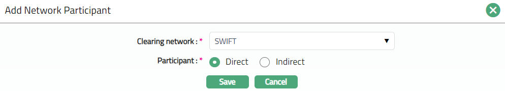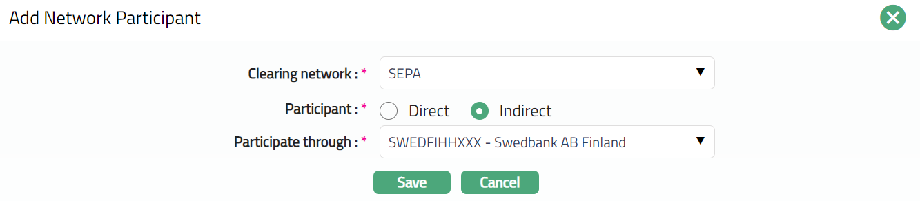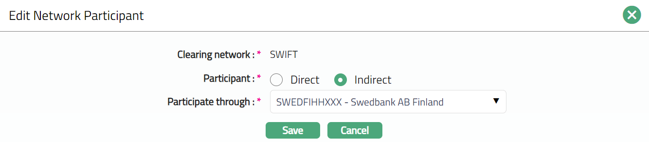 - Select Participate through from the available drop-down list which display values from the Correspondent bank management-maintained list where Participant for the clearing network selected = Direct.
