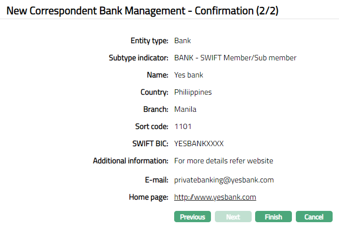 Click Next. Correspondent Bank Management - Confirmation (2/2) page appears.