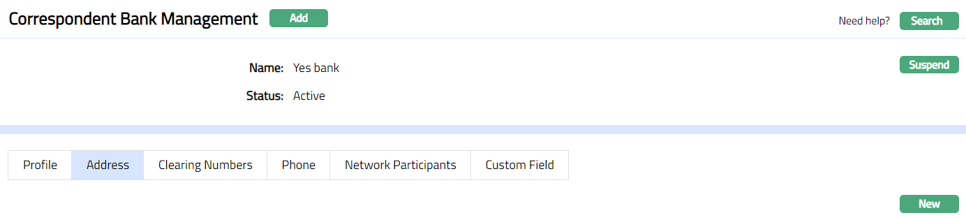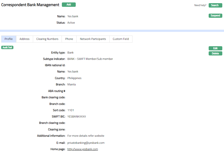 - Click Finish. Correspondent Bank Management page appears displaying the details of the financial institution / intermediary that you added under the Profile tab. Account Status is Active.