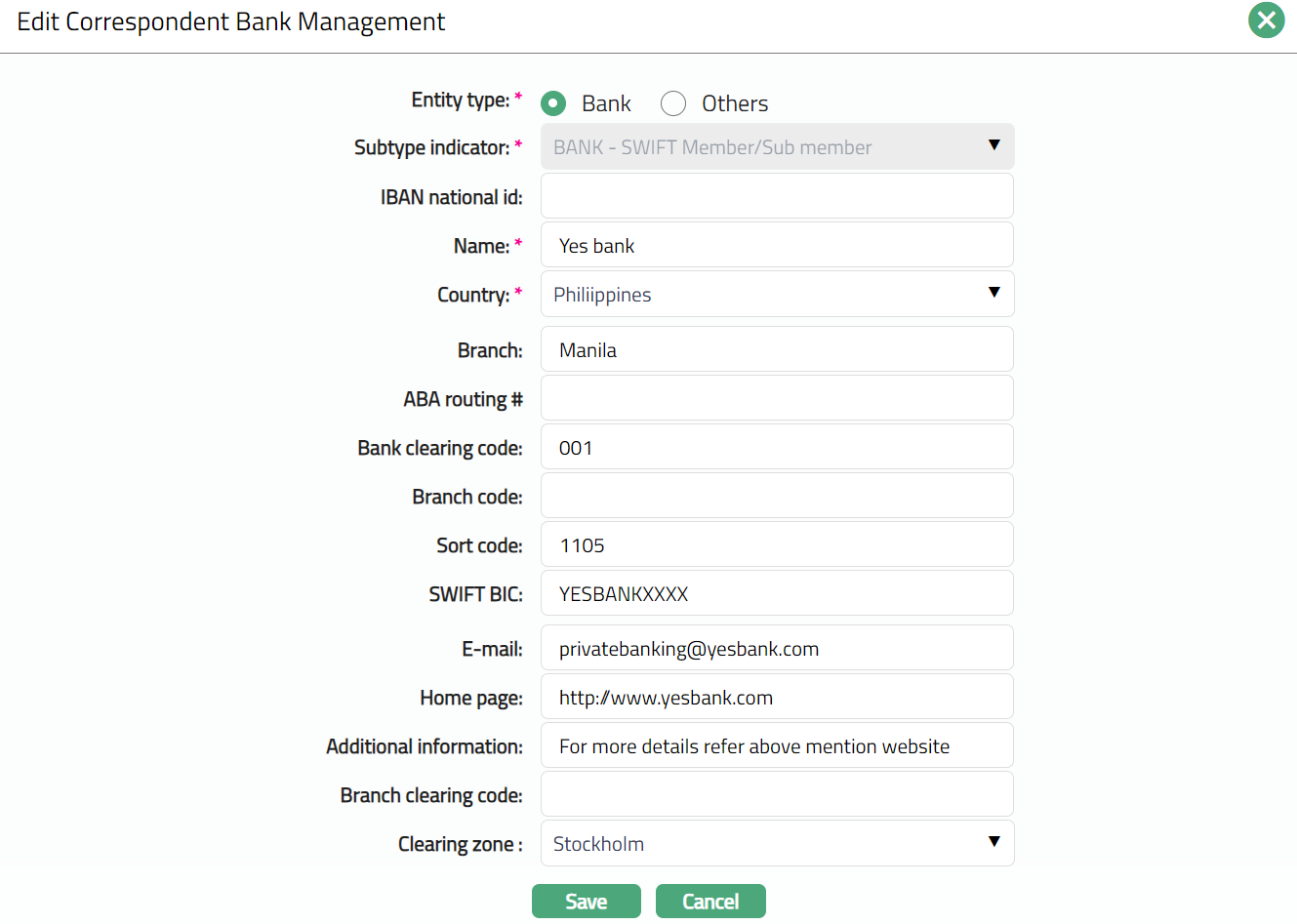 - Click Save. Correspondent Bank Management page appears with the edited details.
