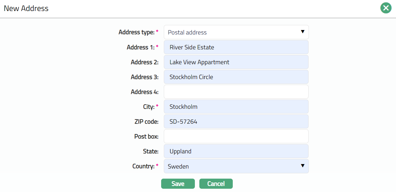 Select Address type from the drop-down list of address types maintained under Admin > System codes > Address details > Address types.