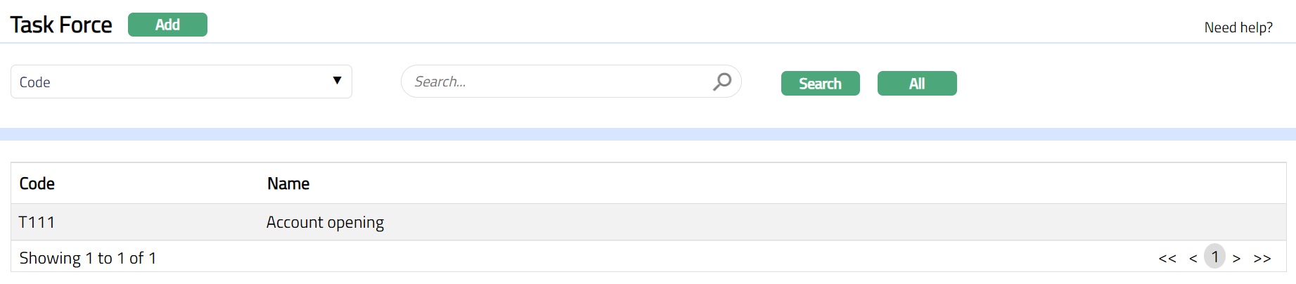 - From Admin menu, click Entities, and then Task forces. Task Force Search page appears. All task forces available in Aura appear on the page.