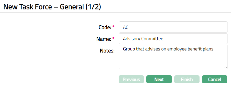 Enter Notes for the task force. For example, Group that advises on employee benefit plans.