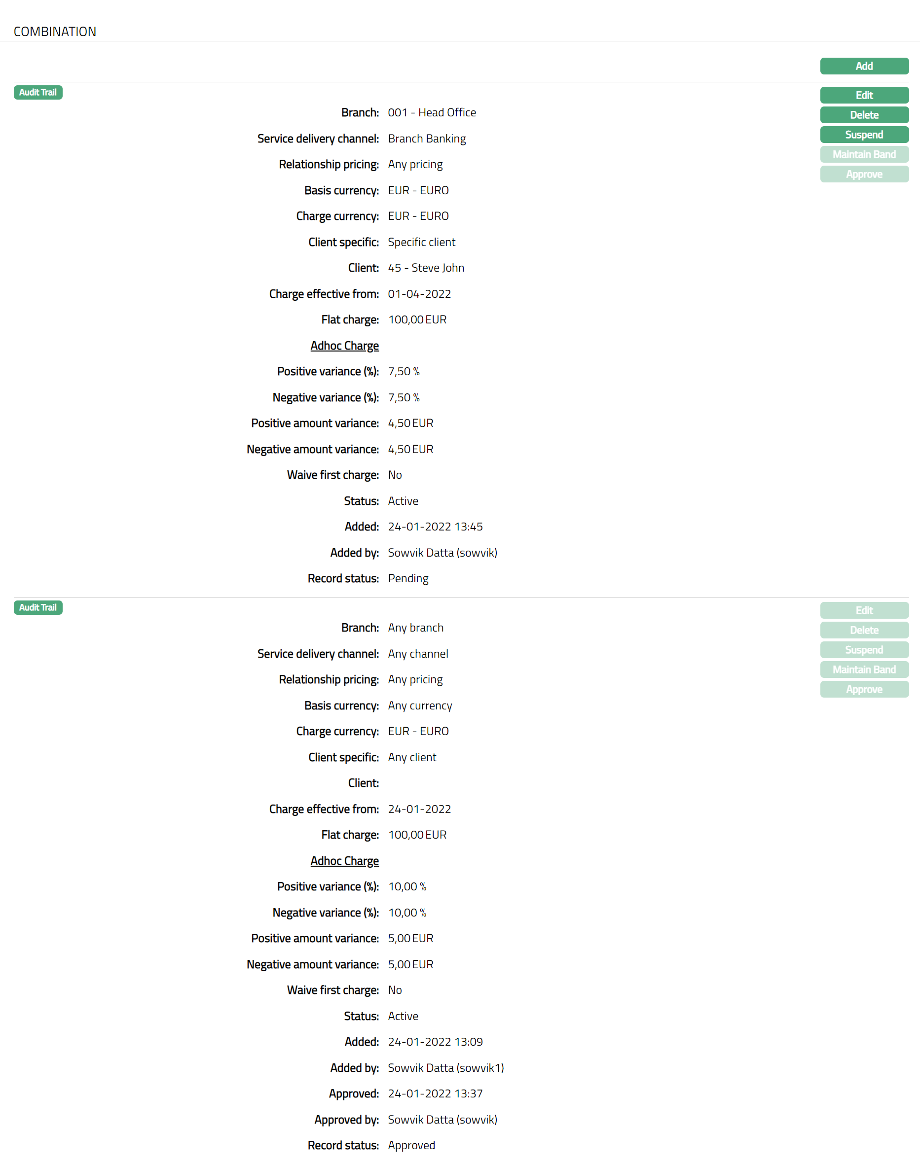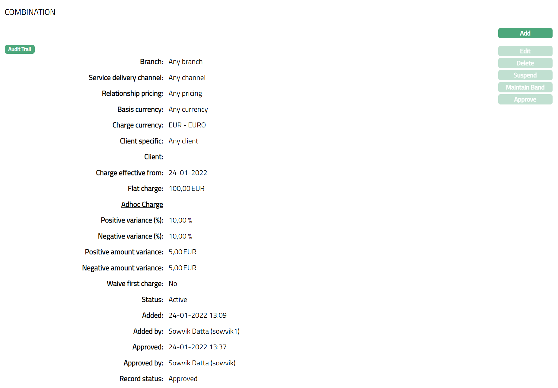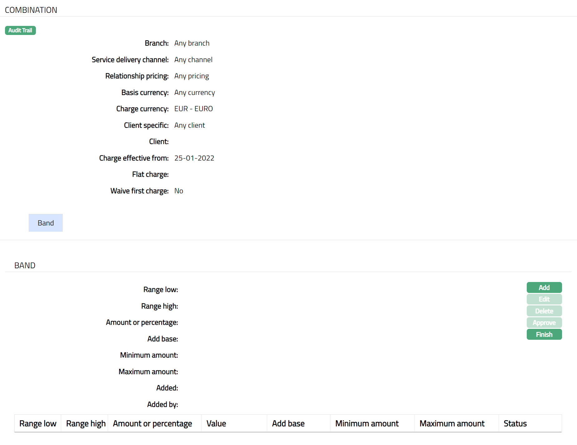 Note: Once the default charge combination record is created, the Edit, Delete, and Suspend button will be disabled and only the Maintain Band button will be enabled. For other combinations the Edit, Delete, Suspend and Maintain Band buttons will be enabled.