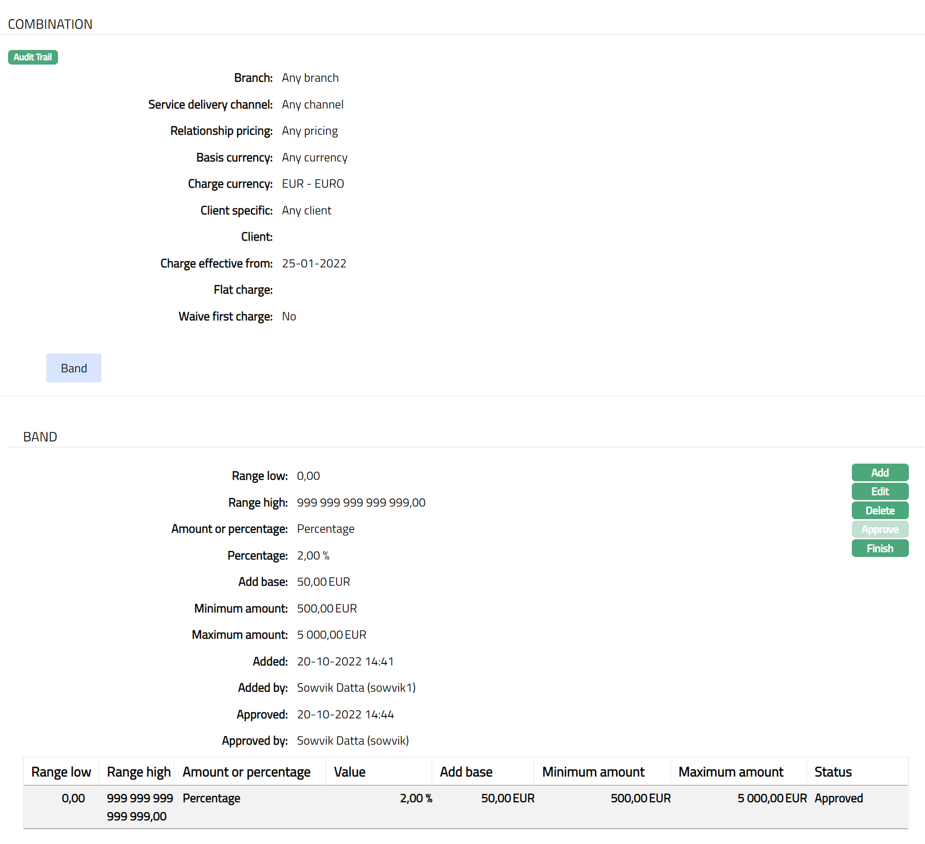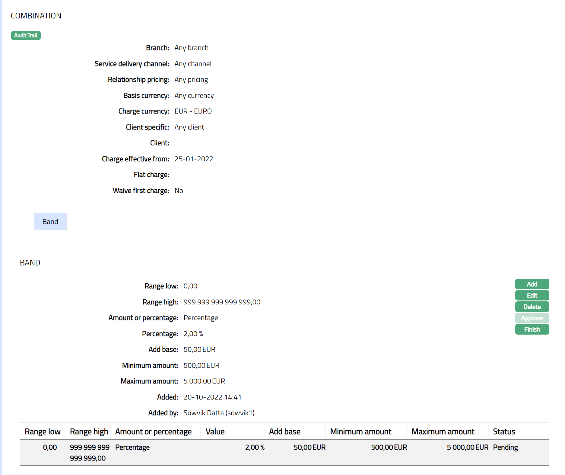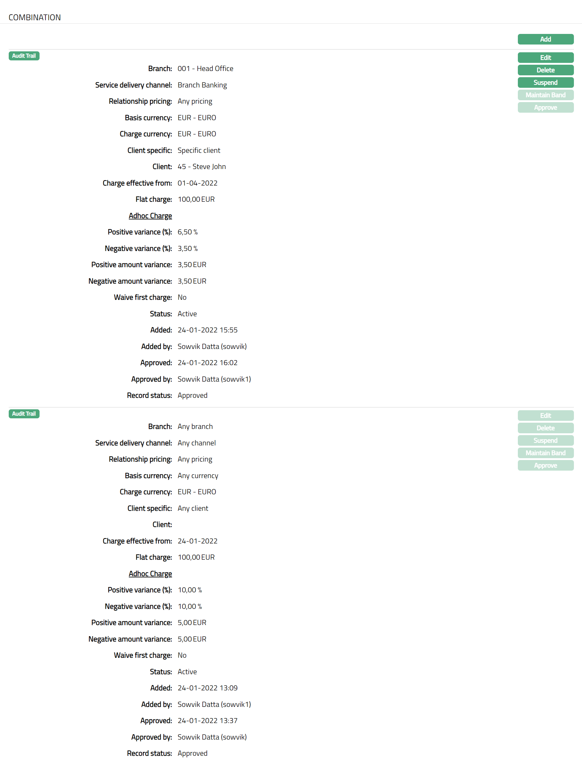 Note: Once the default charge combination record is created, the Edit, Delete, and Suspend button will be disabled and only the Maintain Band button will be enabled. For other combinations the Edit, Delete, Suspend and Maintain Band buttons will be enabled.