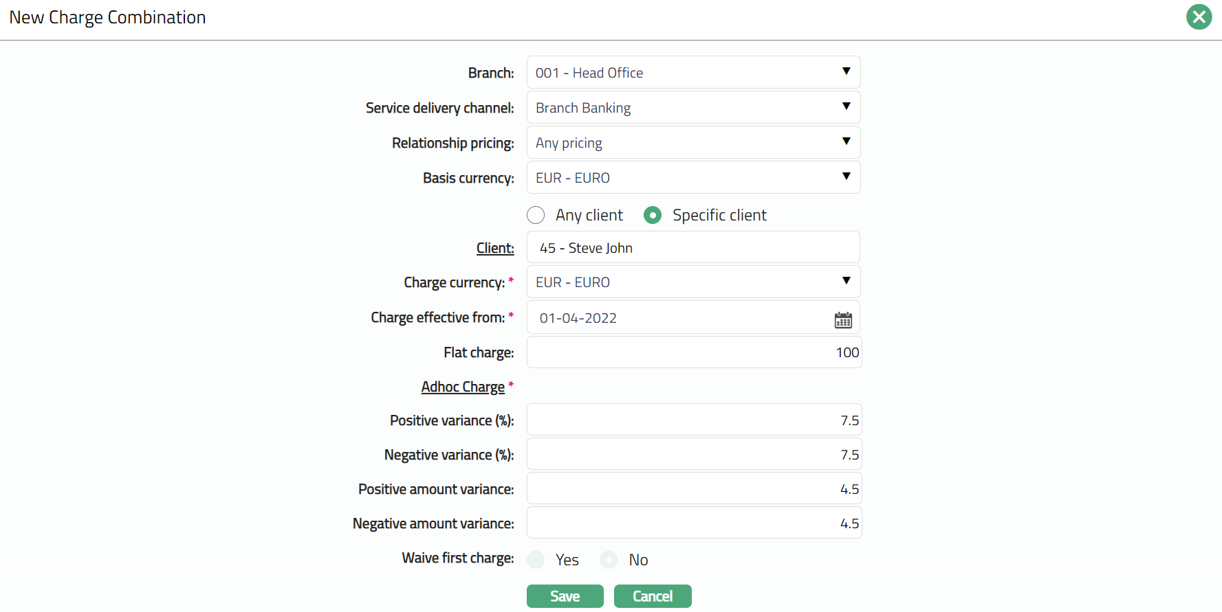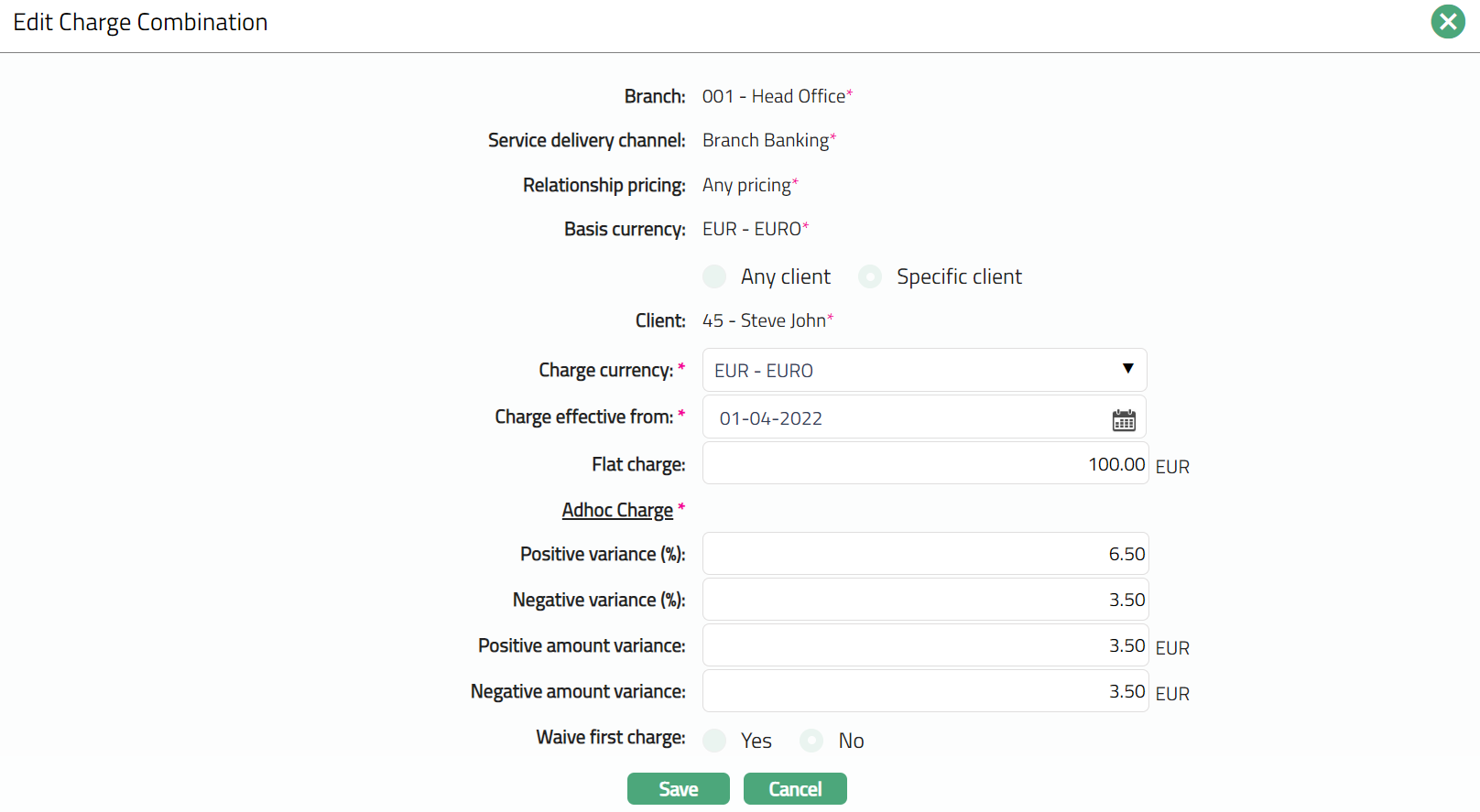 Note: Except Branch,Service delivery channel, Relationship pricing, Basis currency, Any client and Specific client radio button, Clientand waive first charge, rest all other fields are editable.