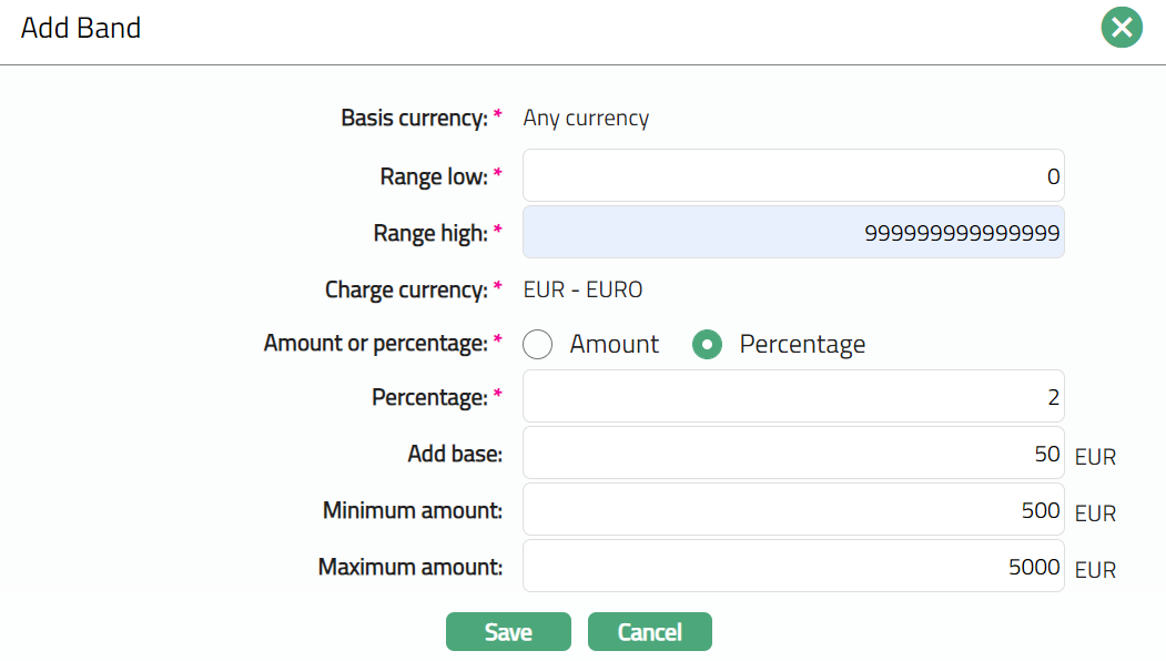 Specify if you want the charge for the Band to be a fixed amount or a percentage using the Amount or percentage field. Accordingly, the charge amount will be taken as the fixed amount for the band or calculated using the percentage and the basis amount.