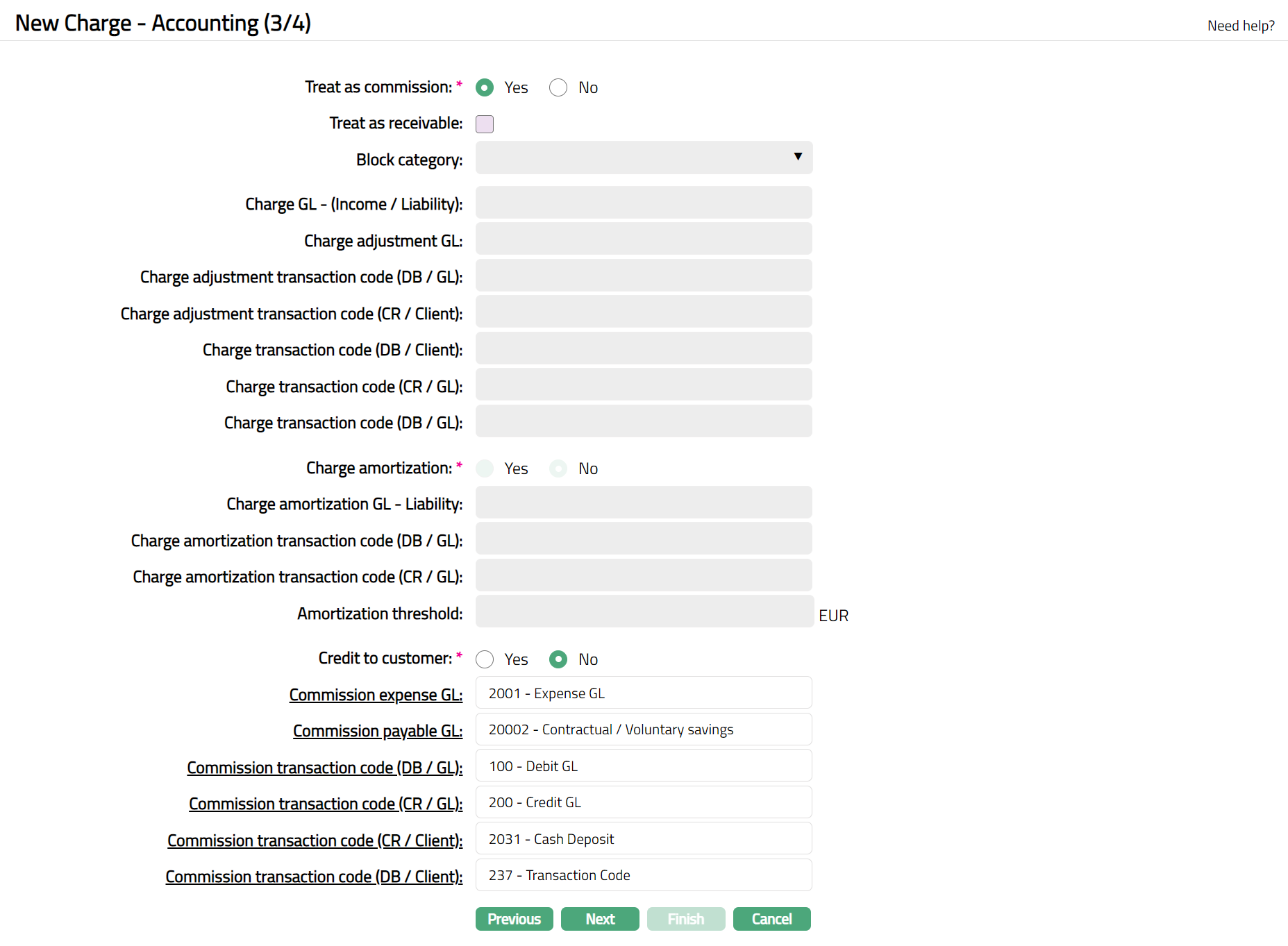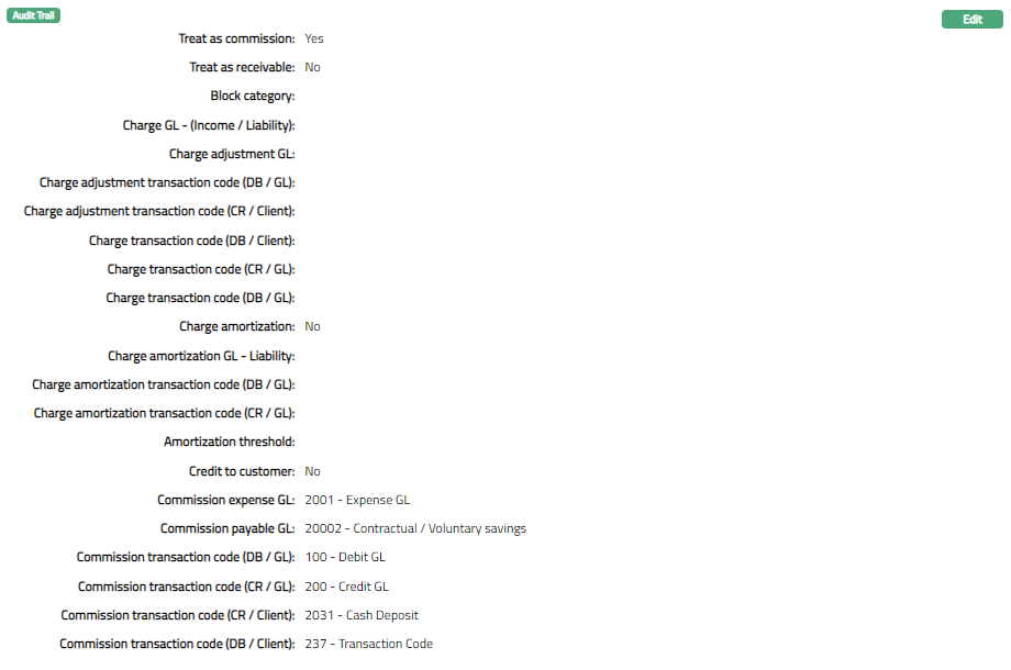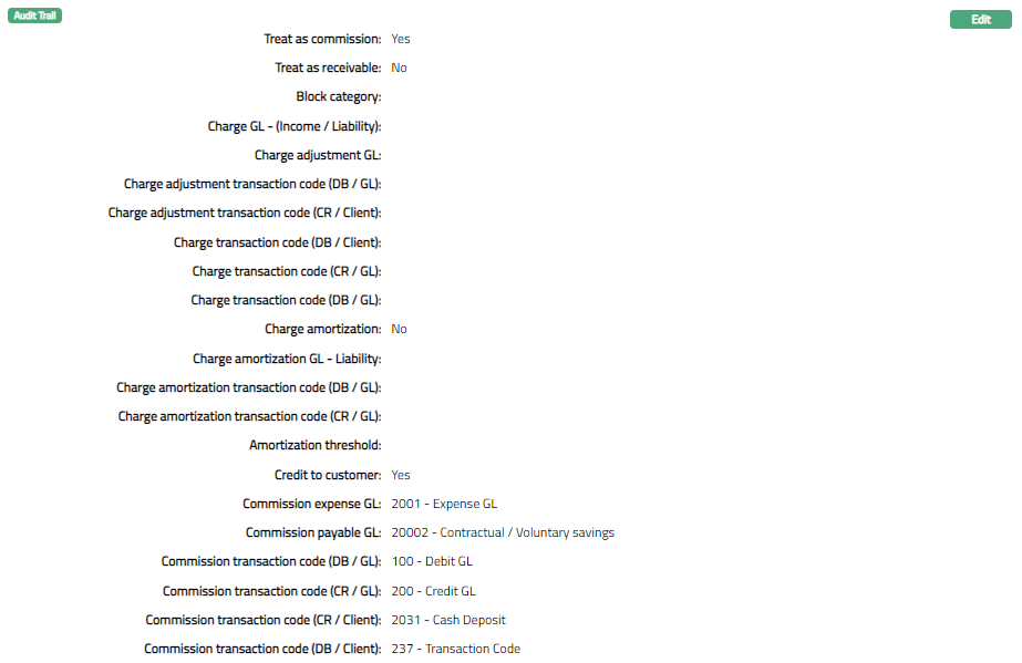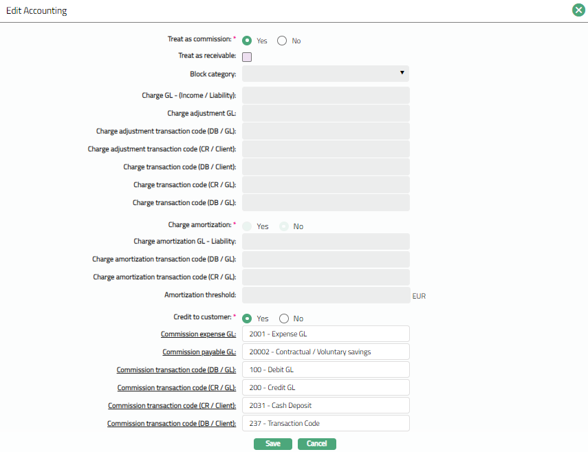 If Treat as Commission is Yes, then Charge GLs and Transaction codes will be disabled; Commission GLs and Transaction codes will be enabled. If Treat as Commission is No, then the Commission GLs and Transaction codes will be disabled; Charge GLs and Transaction codes will be enabled.