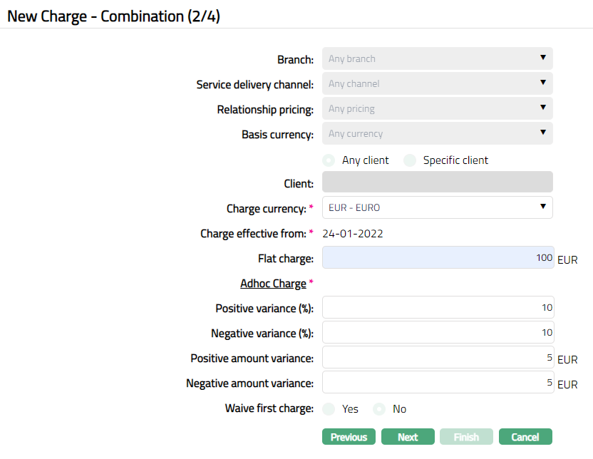 Values for Branch, Service delivery channel, Relationship Pricing, Basis Currency, Charge Currency, Client specific, Client, Charge effective from, Flat charge, Waive first charge are derived from the Combination that is maintained.