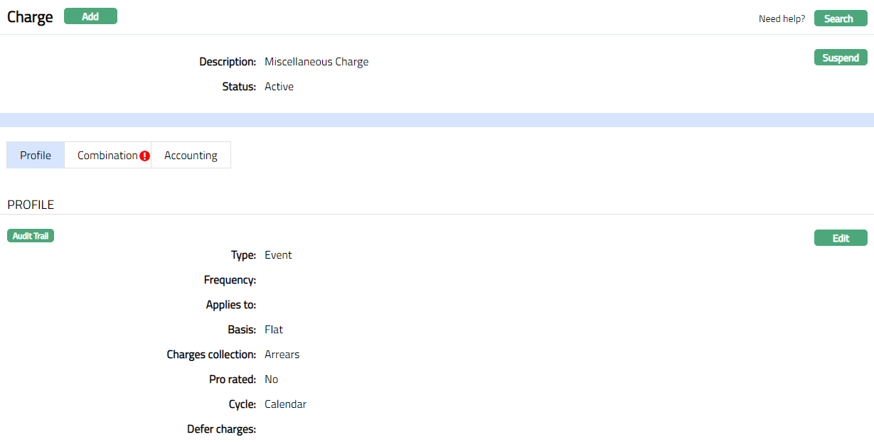 - Access Charge screen and click Combination tab. The Combinations that already exist for the Charge are displayed.