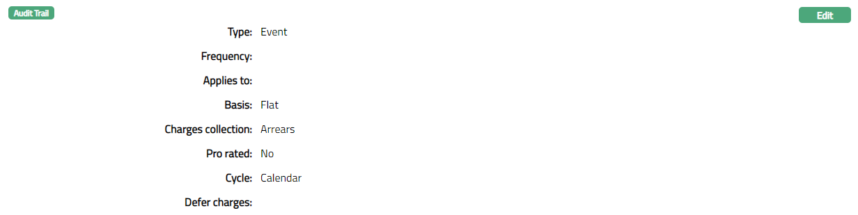 If the charge is Periodic and with a Frequency of Month, Quarter, Semi-annual or Annual, you can specify if the charges are to be collected on a pro-rata basis using the Pro-rated option. For example, continuing our previous example, if the charge has been marked as Pro-rated Yes, then, the charge will be collected only proportionately for 10 months. In case Pro-rated is No, then, the full charge will be collected.