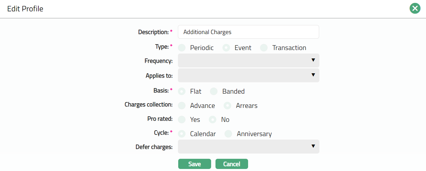Waive first charge will be enabled only if the charge type is periodic in nature. If Yes is selected, then this specific charge applicable for the first time on an Account will be waived. By default, No will be selected.