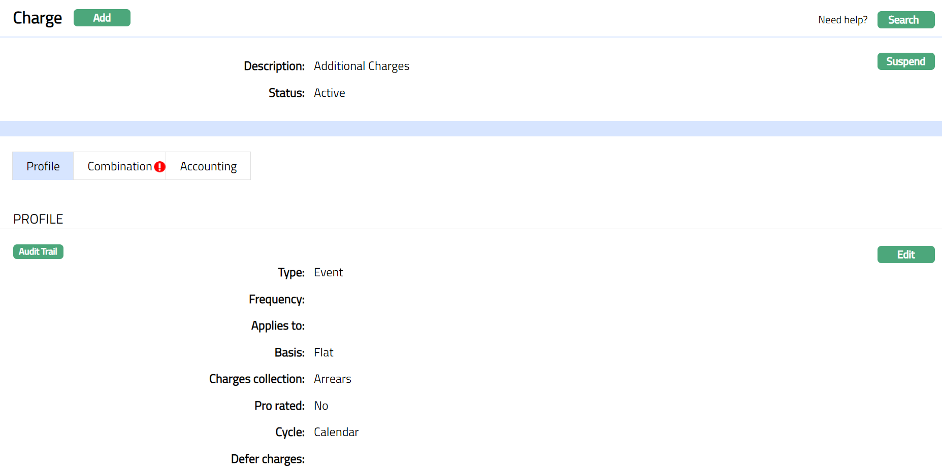 Activate: If you want to activate a suspended Charge record then click on Activate button. Aura will ask for confirmation. On confirmation Aura will Activate the Charge and Suspend button will appear in place of Activate button.