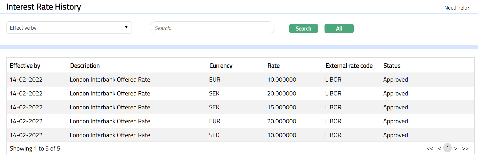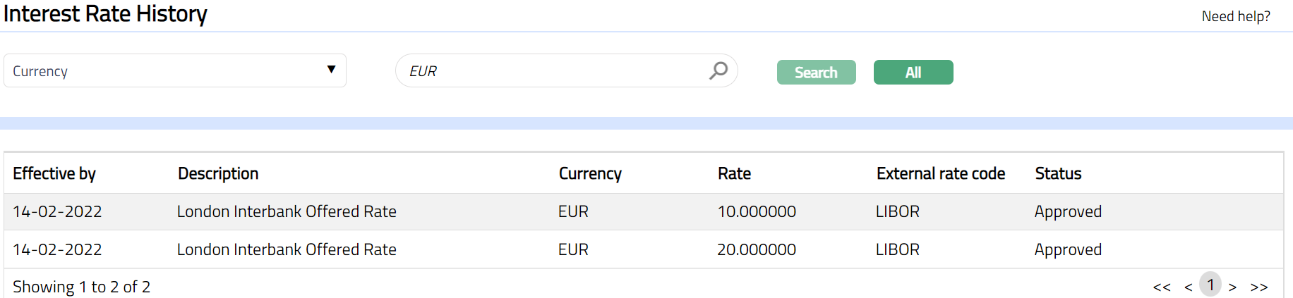 5. Click Search. All the Interest Rate History records available in Aura, which satisfies the search criteria, will appear on the page. A sample is given below.
