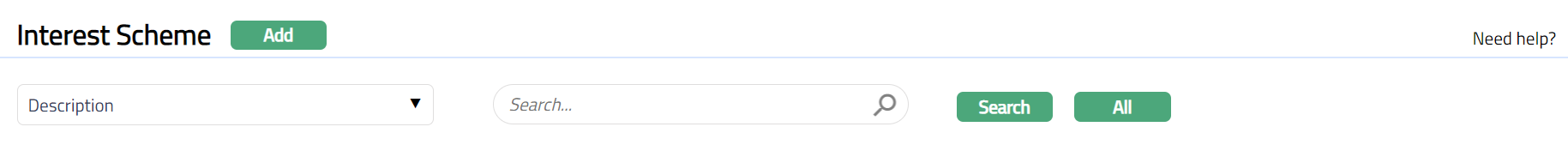- From Admin menu, click Pricing Interest, and then Interest Scheme. Interest Scheme Search page appears. All Interest Schemes if available in Aura will appear on this page.