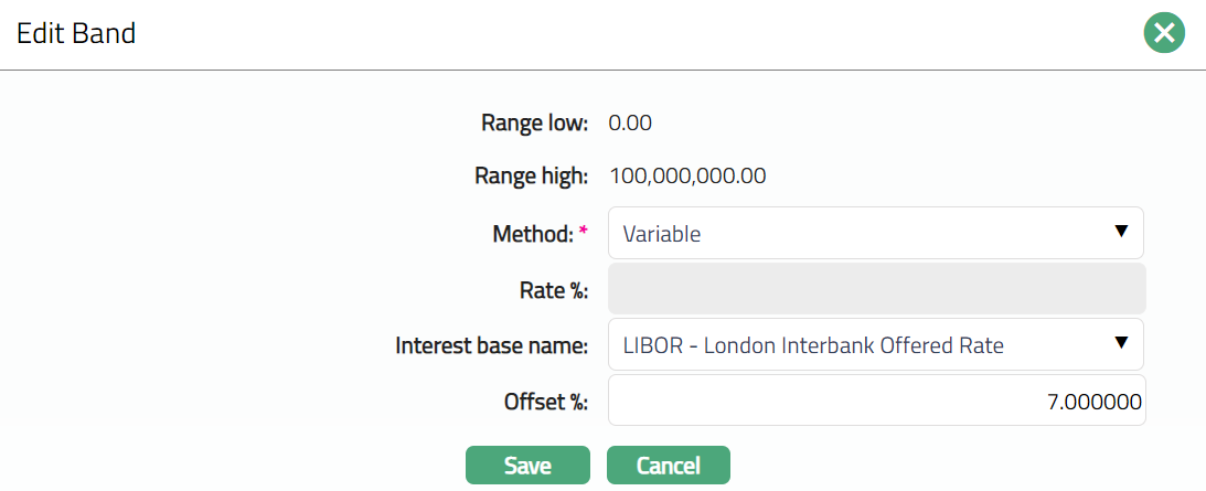 If you select Fixed or Method, the Rate % field will be enabled. Enter the fixed rate% for the Band.