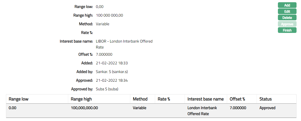 Note: Status of the Interest scheme entered is pending. Any user other than the one who has created the Interest scheme record can Approve it.