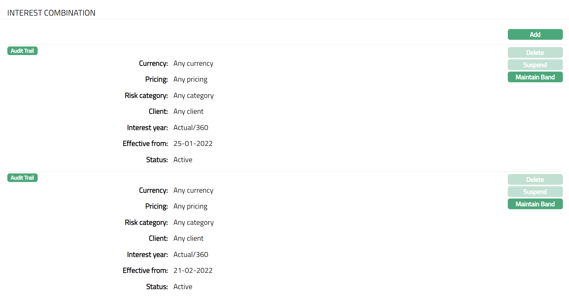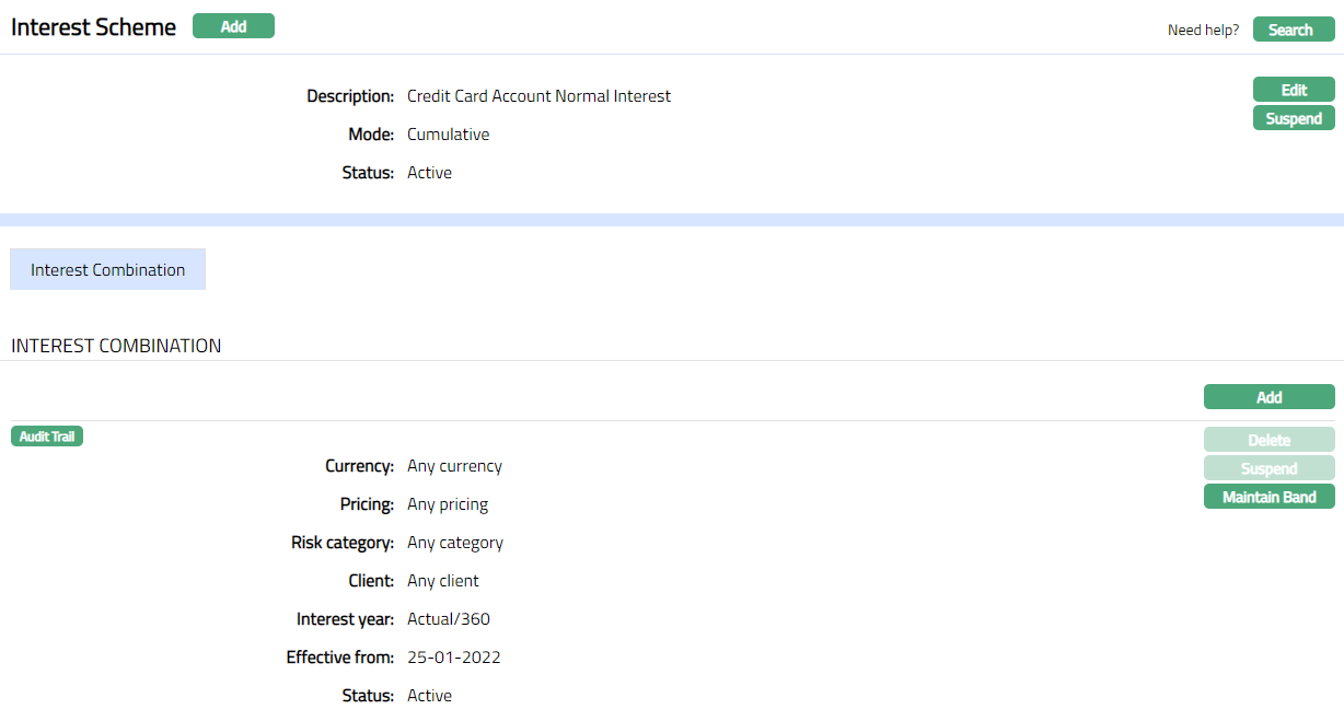 Note: Once the default interest scheme combination record is created, Delete, and Suspend buttons for the Default Combination will be disabled and only the Maintain Band button will be enabled.