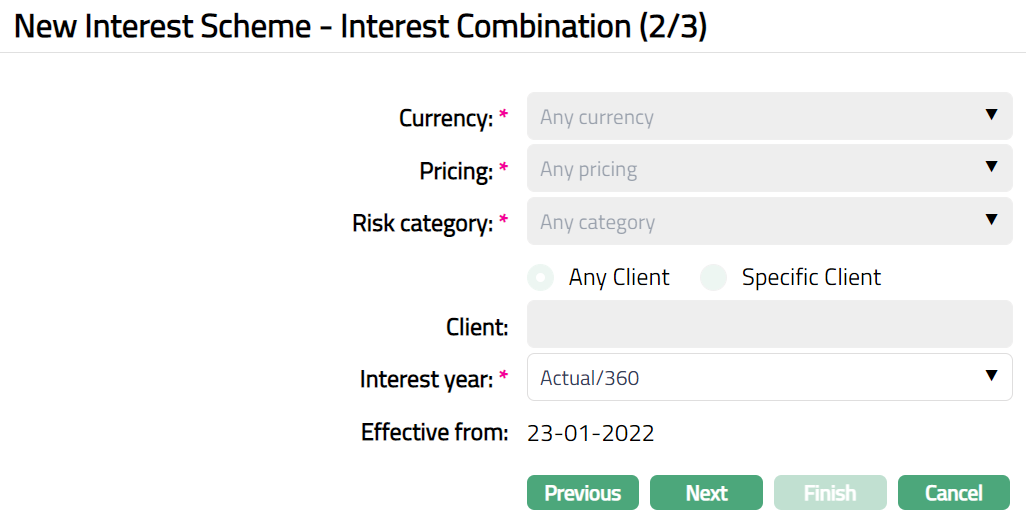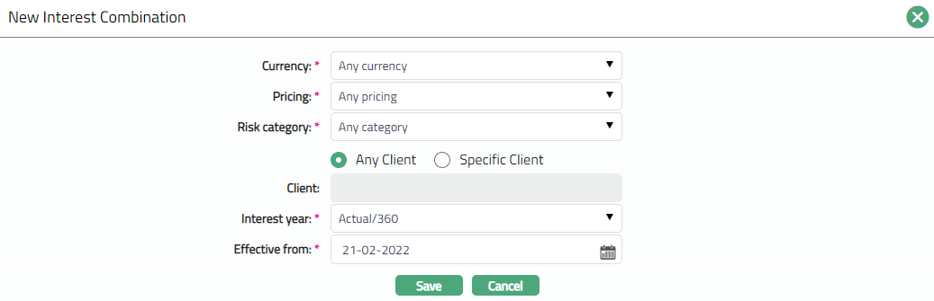 When Interest Scheme is first created, a default Combination of currency, pricing, Risk category and Client is automatically created -- These fields are non -- editable and have the default values Any currency, Any pricing Any category and Any Client respectively. This ensures that a default interest combination is available for all the accounts. If required, you can create additional Combinations by choosing a specific currency, pricing, Risk category and client or any combination of these as required. Refer to the section on Adding an Interest Combination below.