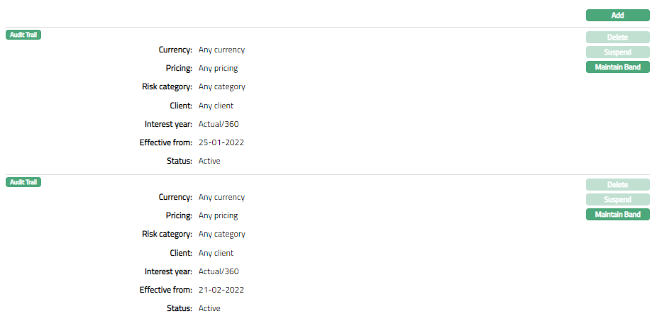 This option allows you to create the required combination of Currency, Pricing, Risk category and Client as you require for calculation of Interest.