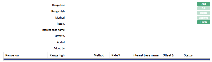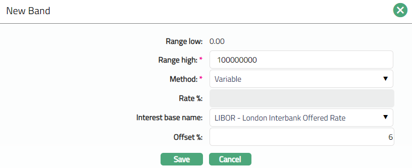Range Low defaults to Zero for the first band. For the succeeding bands, it is automatically set as Range high of the previous band + least decimal of Interest currency. In case of Any Currency, the number of decimals is taken as 2.