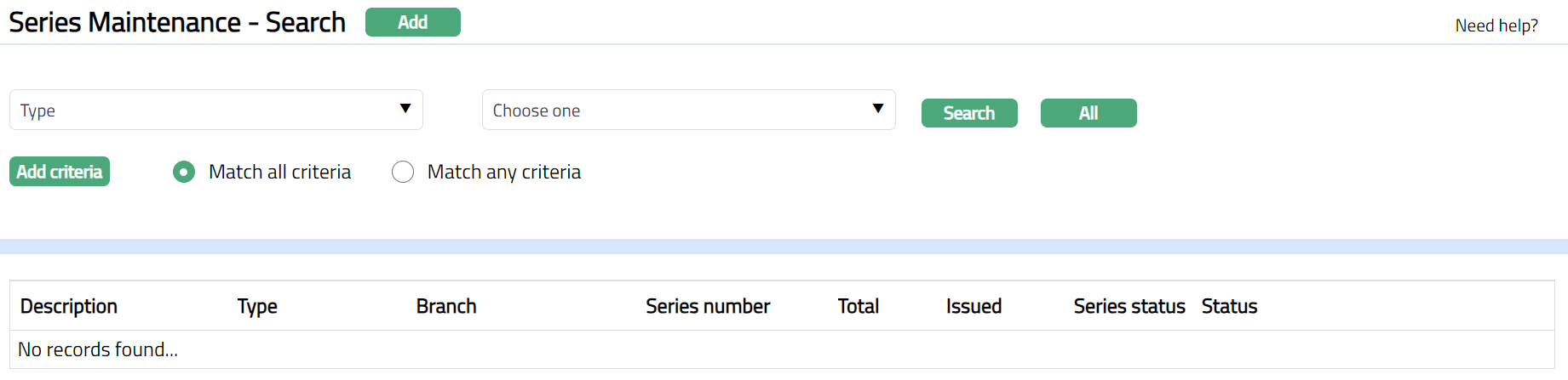 From drop-down list of active branches maintained at Admin > Branches > Maintain, select the Branch for which the series is generated.