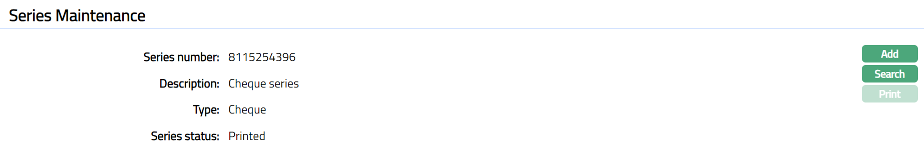 Note: Once approved click Print to print the cheque book. The Series status will be displayed as Printed. Sample screen shown below.