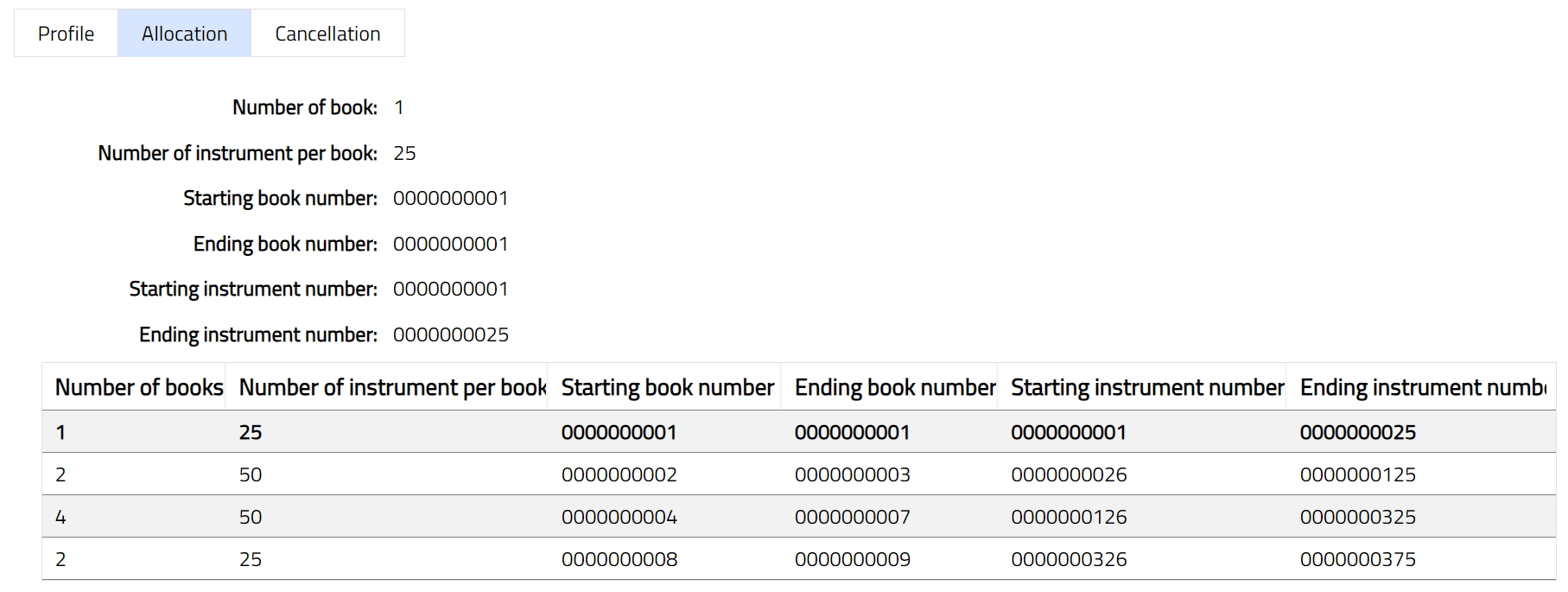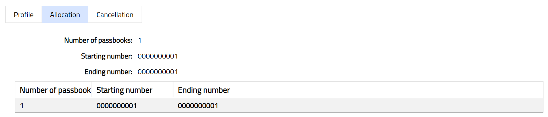 Allocation tab allows you to view the details of the number of passbooks allocated to the client. It also displays starting and ending series numbers.