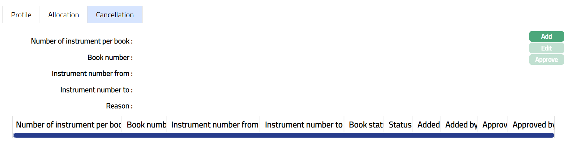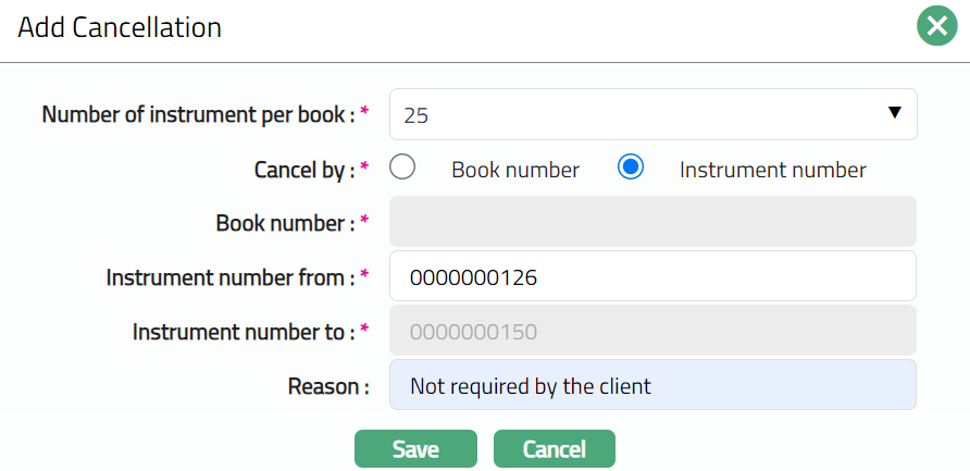Cancellation tab allows you to cancel the required cheque book allocated to the client. It also displays the cheque book and instrument number which is deleted.