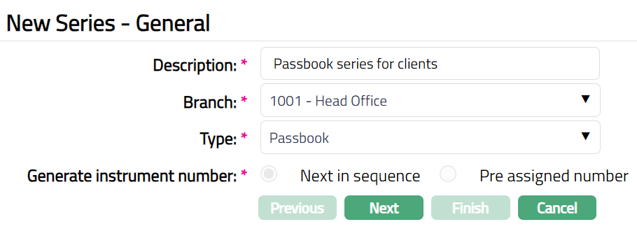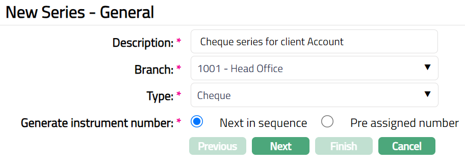 Series allows you to generate the instrument inventory against the series for types of instruments used in banks such as cheques, passbook, Term deposit certificate, demand drafts etc. Currently Aura supports only generation of instrument inventory of Cheques, Passbook and Term deposit certificate.