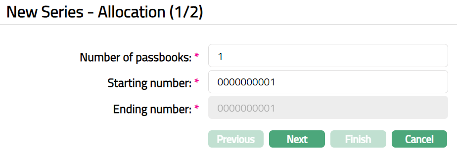 Example: If the passbook number of the last generated passbook is 0000000010 then the Starting number will be 0000000011.