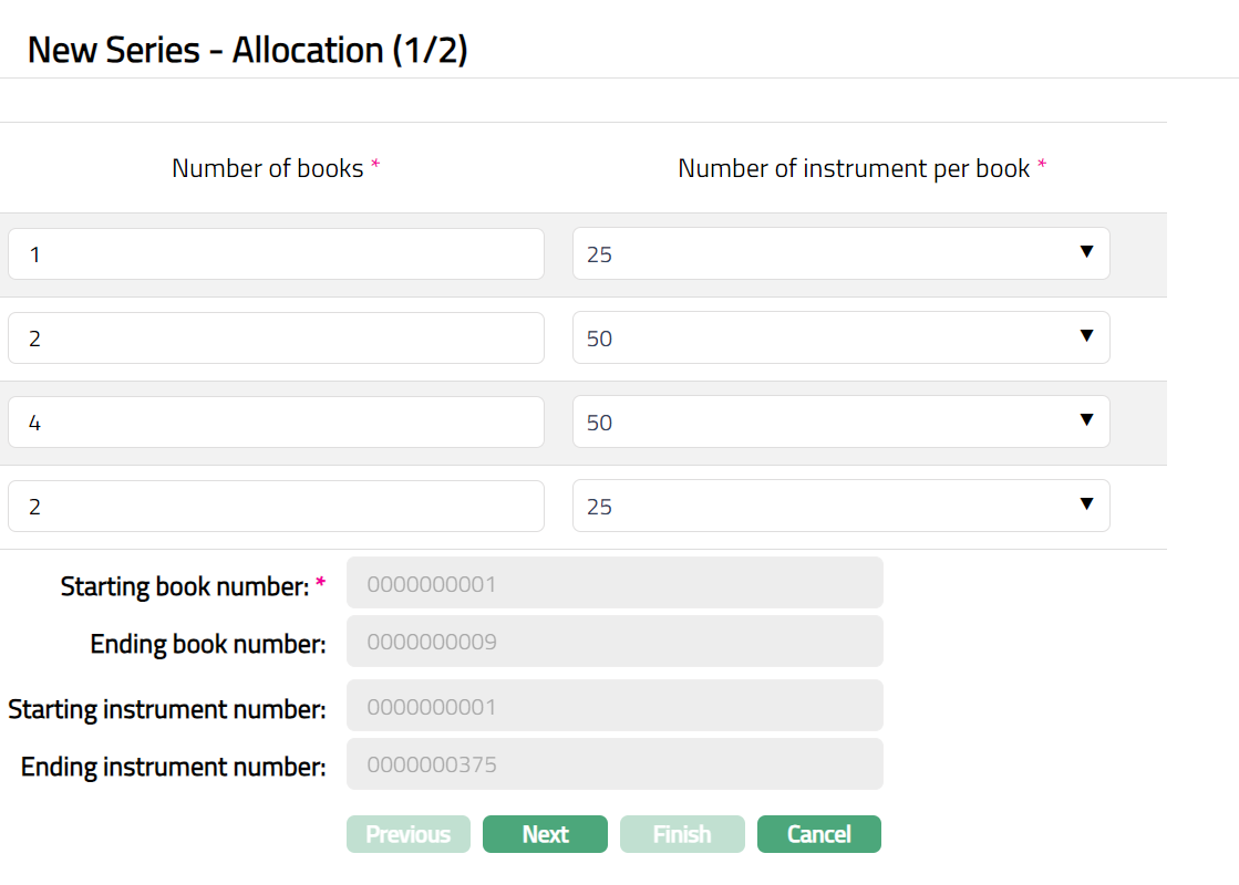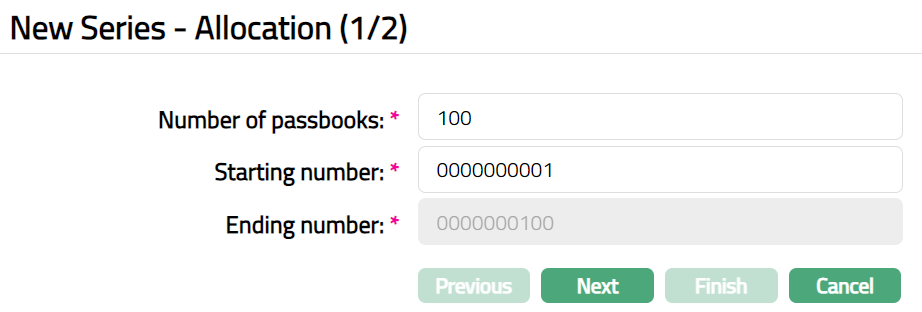 Aura will calculate the Ending number as (Starting number + Total Number of Passbooks selected in the rows above - 1) and display it in the Ending number field.