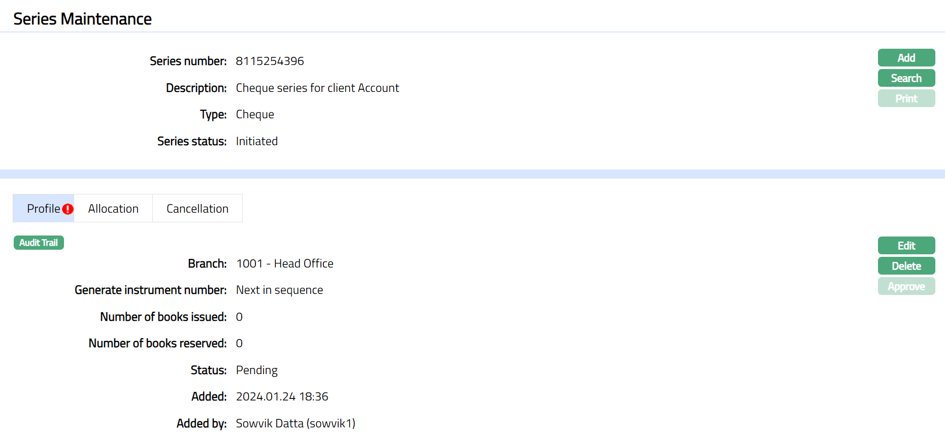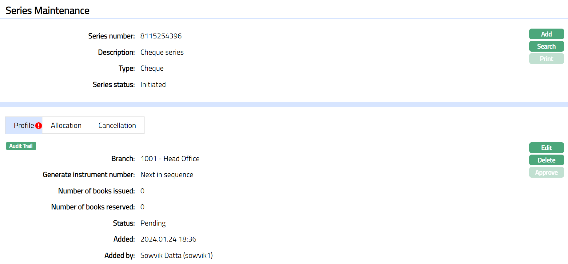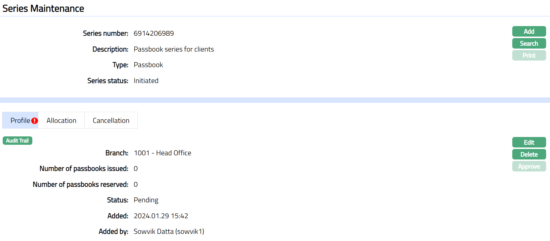 Note: Once added/edited the record status is set to Pending till it is approved by another user. On approval, the record status is set to Approved and the series status will display as generated. Aura allows you to edit the profile until the series record is in the Initiated status.